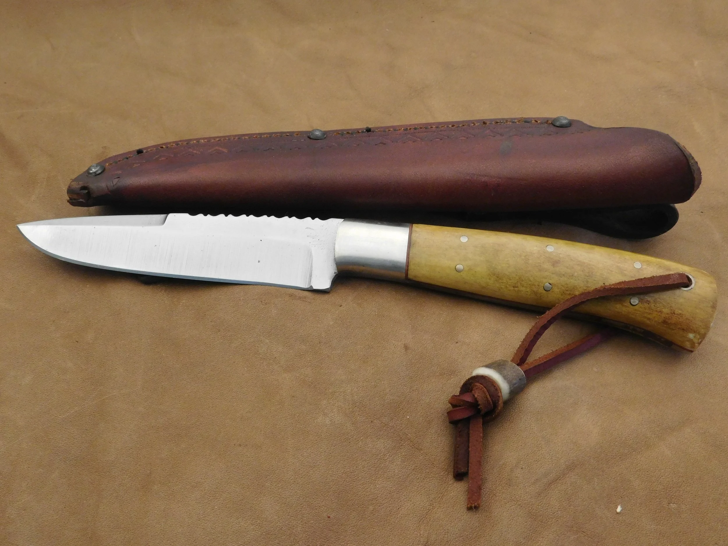 Utility knife in 52100 ball bearing steel. Antique polished Moose antler handle with nickel silver guard. Blade: 4-1/2 in. O.A.L length 8-1/4 in. $95
