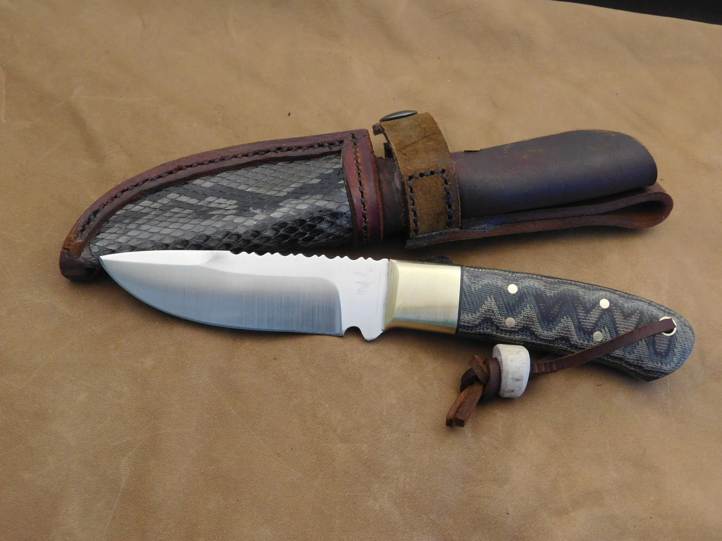 Hunter/skinner in AEB-L stainless razor steel. "Python" Micarta handle with brass bolsters. Decorative spine filing. Python skin sheath inlay. Blade:4 in. O.A.L. 8 in. $135