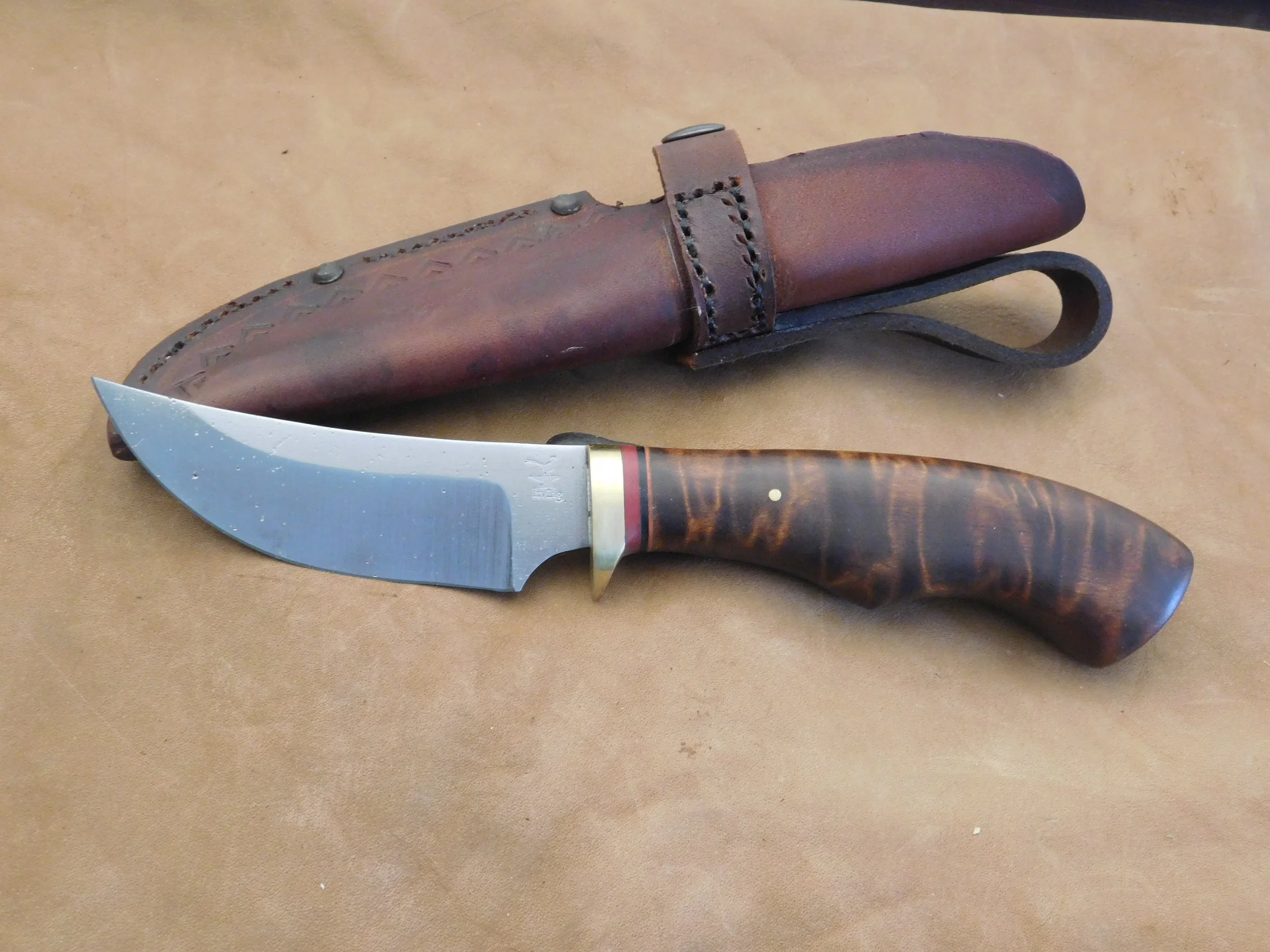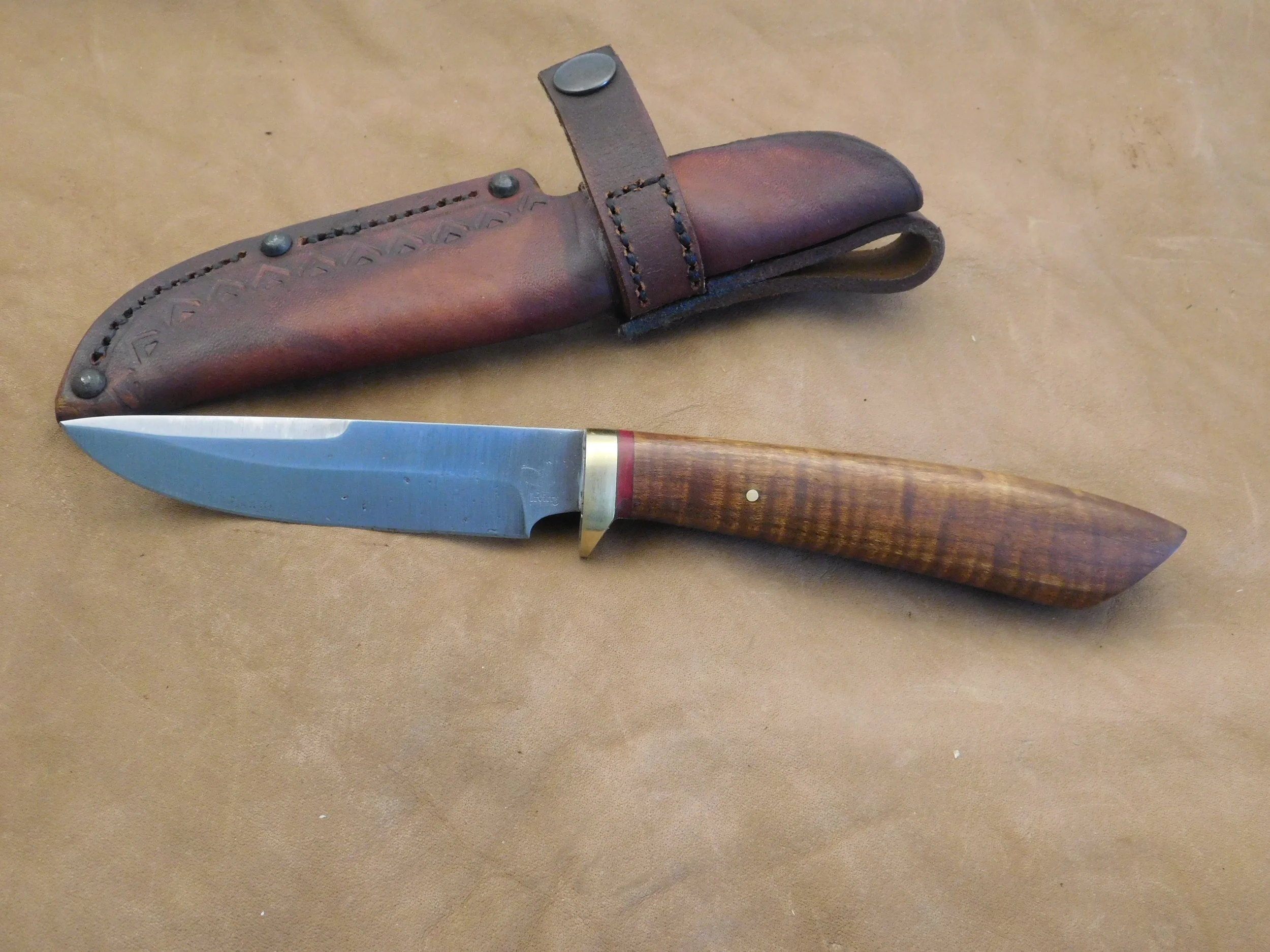 Trailing point hunter/skinner in 52100 ball bearing steel. Figured Maple handle with brass guard. Blade:4 in. O.A.L. 9 in. $95