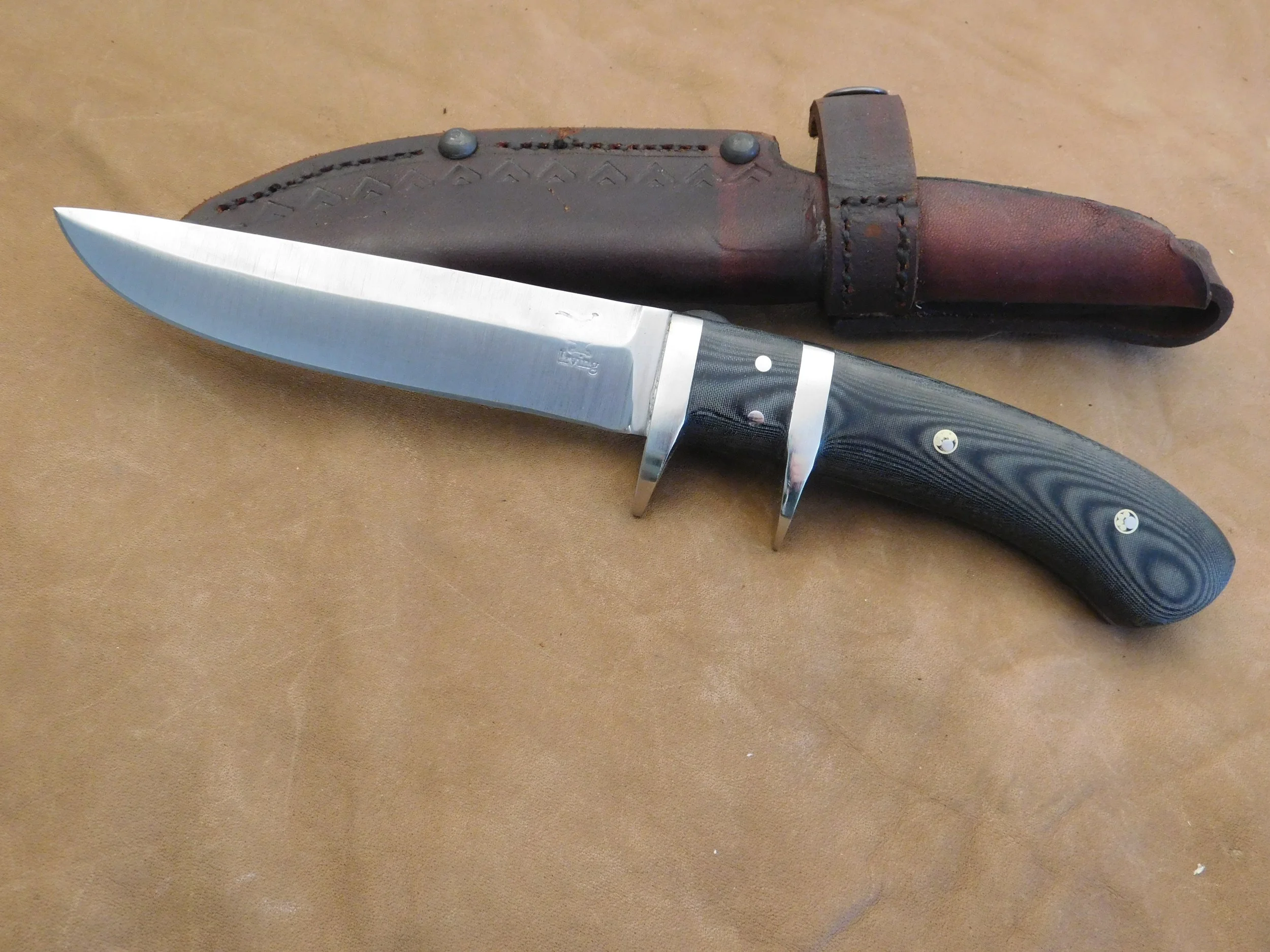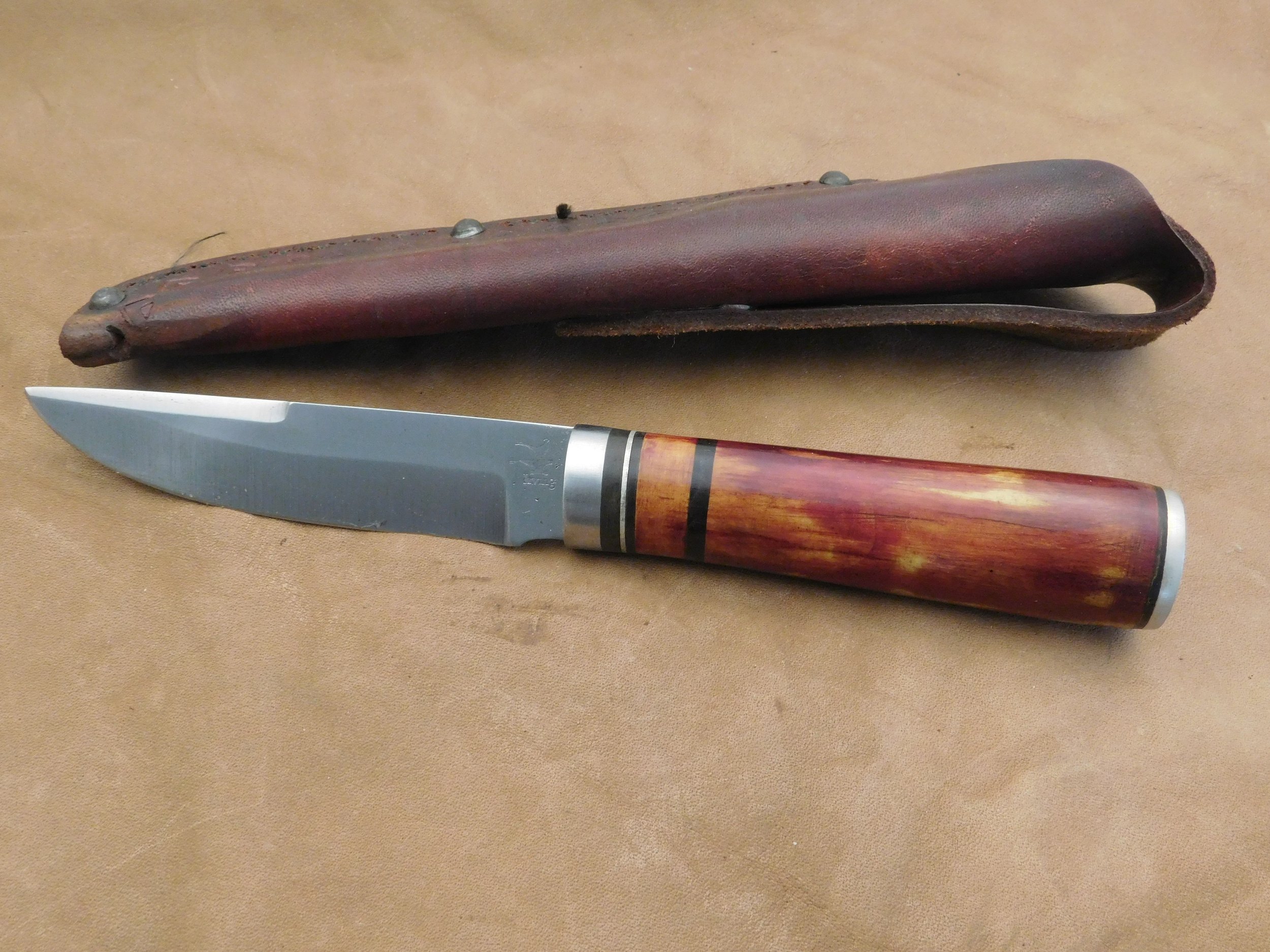 Trailing point Hunter/Skinner in 52100 High carbon steel. Stacked leather handle with stainless steel guard. $125
