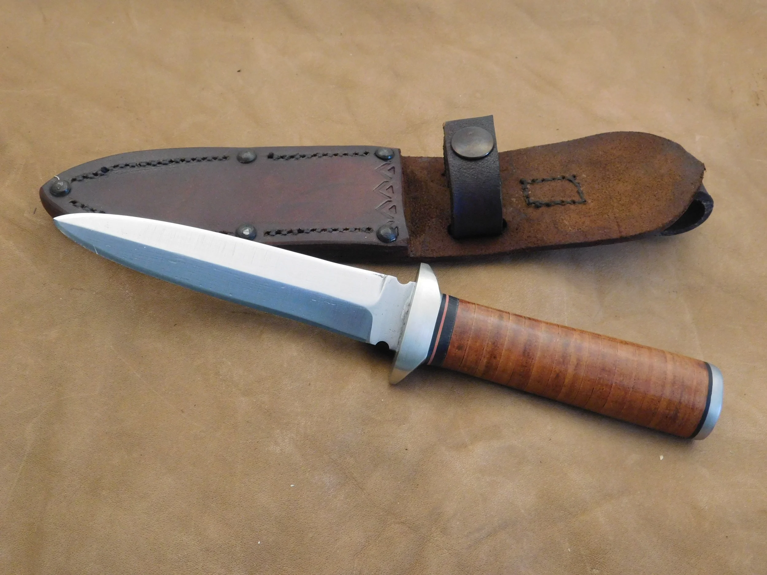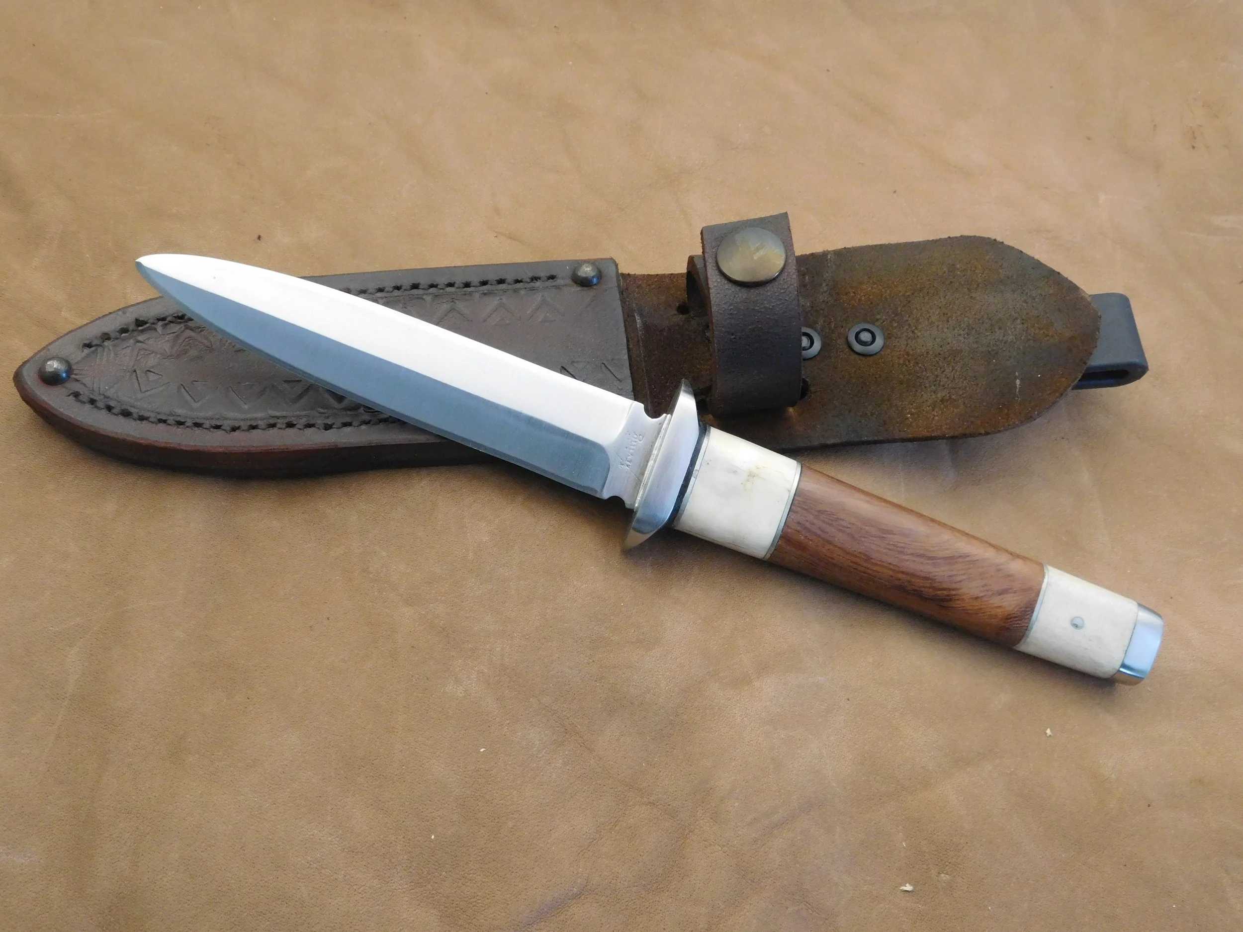 Dagger in 52100 ball bearing steel. Stacked leather handle with nickel silver guard. Blade:4-3/4 in. O.A.L. 9 in. $105